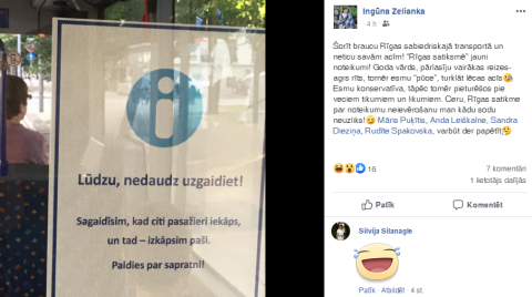 Ingūna „Facebook” ierakstījusi neizpratnes pilnu jautājumu: „Šorīt braucu Rīgas sabiedriskajā transportā un neticu savām acīm! “Rīgas satiksmē” jauni noteikumi! Goda vārds, pārlasīju vairākas reizes. Esmu konservatīva, tāpēc tomēr pieturēšos pie veciem tikumiem un likumiem. Ceru, „Rīgas satiksme” par noteikumu neievērošanu man kādu sodu neuzliks!”