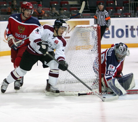 Maksims Sokolovs Krievijas izlases vārtos spēlē pret Latviju pasaules čempionātā Rīgā. (Foto: Gatis Dieziņš/LETA)